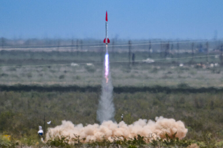 Student-built rocket lifts off from West Texas during the 2025 International Rocket Engineering Competition (IREC). Credit: AIAA–©