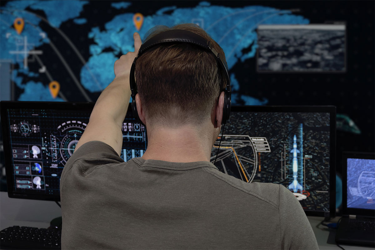 Government official watches monitors at a military intelligence center. | Credit: Olena Bartienieva; iStock–©