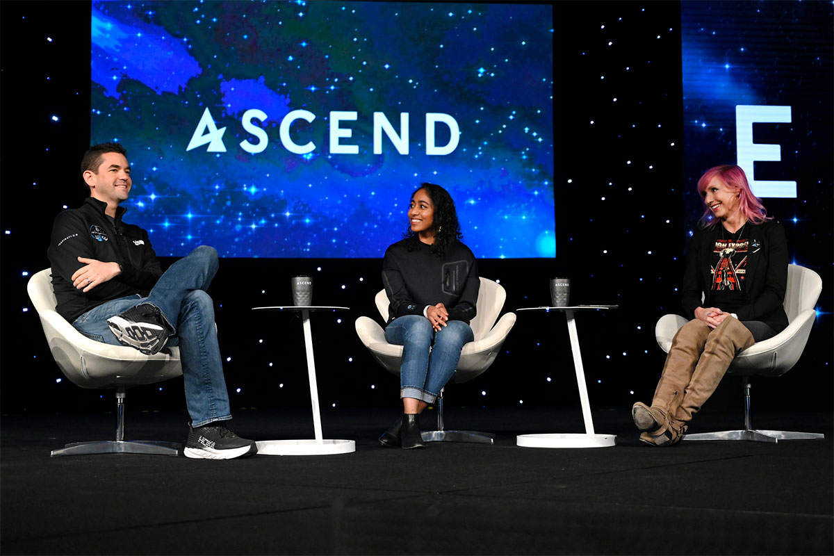 Jared Isaacman (left) participates in a panel discussion during ASCEND 2021. | AIAA–©